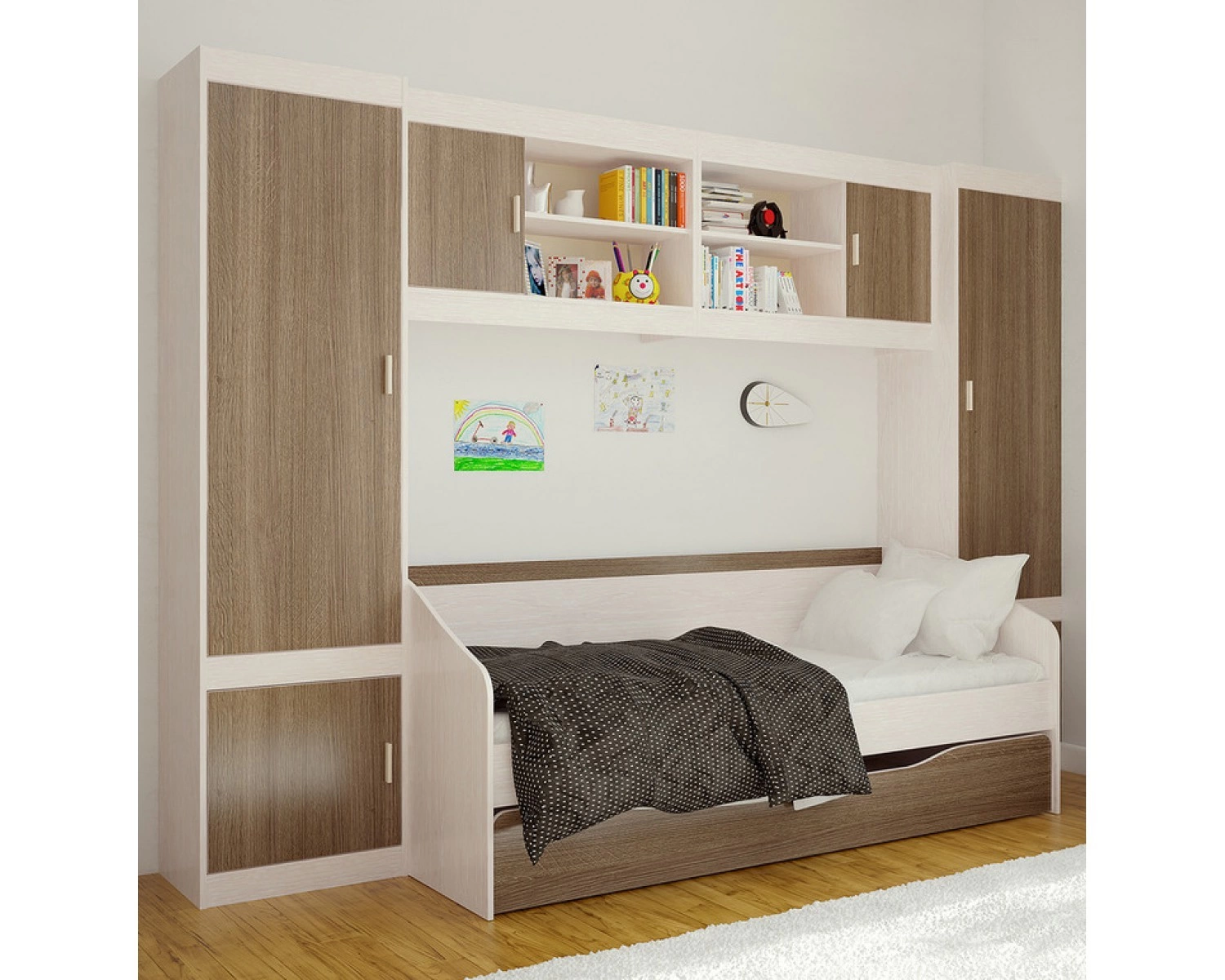 - Общие габариты комплекта у стены (Шкаф+ Навесные Полки + Кровать + Шкаф) : Ширина 3000 мм х Глубина 850 ммх Высота 2100 мм