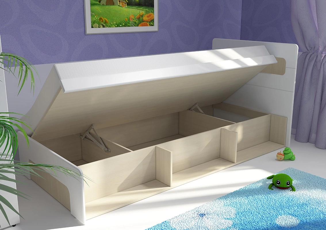 - Кровать имеет металлические подъемные механизмы и секции для хранения